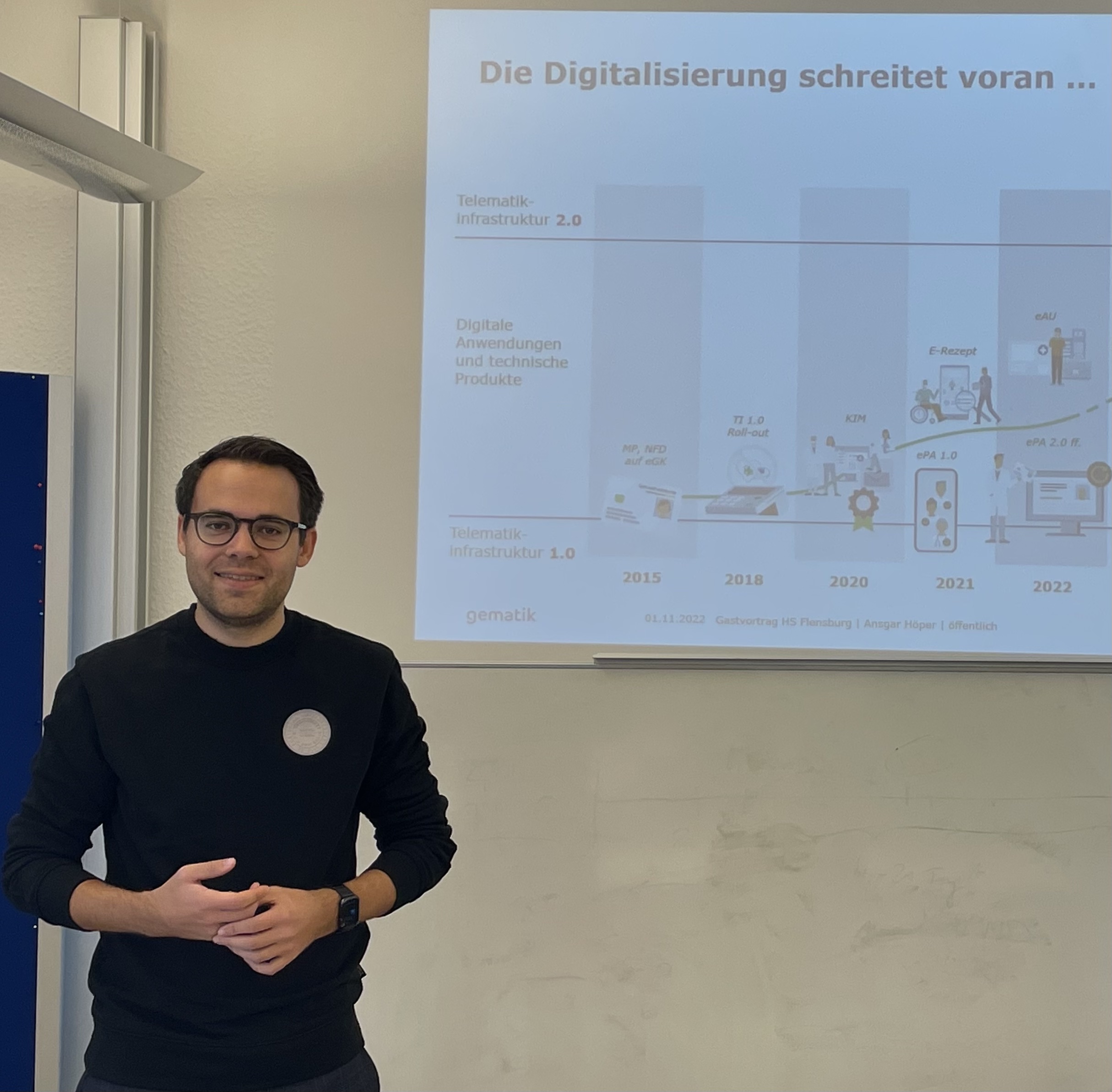 Herr Ansgar Höper, Product Owner Team Data bei der Gematik, brachte den Studierenden die Arbeit der Gematik näher und zeigte aussichtsreiche berufliche Perspektiven auf. Herr Höper, der selbst an der Hochschule Flensburg bereits erfolgreich ihren Bachelor mit Schwerpunkt Management im Gesundheitswesen – als auch ihren eHealth Masterabschluss erfolgreich absolvierte, arbeitet nunmehr seit einiger Zeit als Product Owner bei der Gematik.