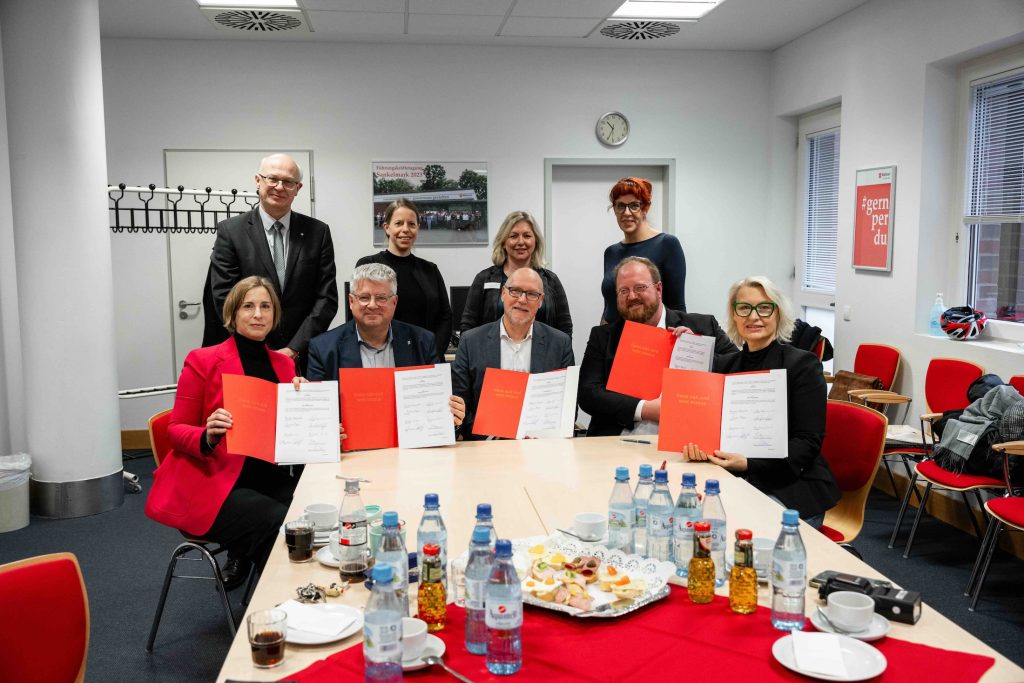 Das Foto zeigt Vertreter der Hochschule Flensburg, der DIAKO Flensburg, der Malteser Norddeutschland gGmbH und des ÖBiZ bei der Unterzeichnung des Kooperationsvertrages.